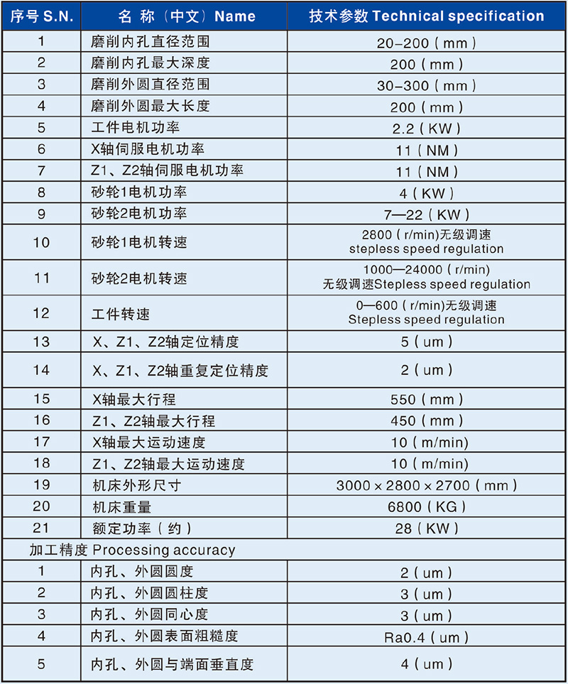 ●本機床爲三軸(X進給、Z1砂輪、Z2砂輪軸)二聯動數控複合磨床,主要用于磨削工件的内圓孔、内錐孔、台階孔、内端面、外…圓、外端面。磨削👩🏽🐰👩🏿循環均自動完成(具有自動進刀~、退刀、粗👹磨、精磨;自動修正砂輪ˇ、自動補償等✡️功能)。