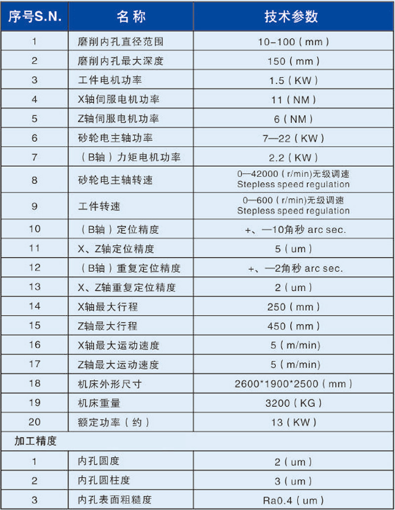 ●本機床爲三軸(X進給、Z砂輪、B分度軸)數控内圓磨床,主要用🏃🏻♀️于磨削工件的内圓孔、内錐孔、内端面、外端面的磨👨🦰削。磨削循環均🧜🏼♂️自動完成(具有自動進刀、退刀、粗磨、精磨;自動修正砂輪、自動補償等功能)。主要技術參數表: