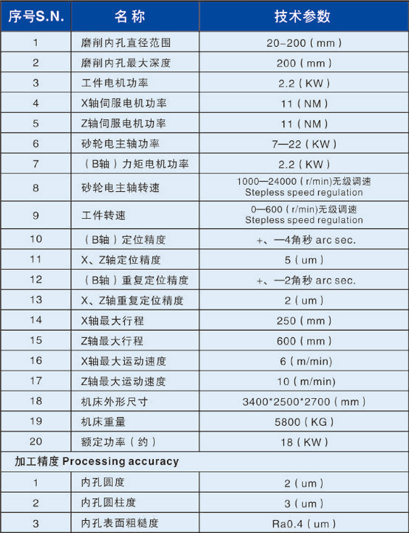 ●本機床爲三軸(X進給、Z砂輪、B分度軸)數控内圓磨床,主👨🏻🏭要用👾于磨削工件的内圓孔、内錐孔、内端面、外端面的磨削。磨削循環均自動👨🦰完成(具有自動進刀、退刀、粗磨、精磨;自動修正砂🙂↕️輪、自動補償等功能)。●機床采用工件進給,B軸分度(力矩轉台),工作台(砂輪架)左右🥑️運動的結構方式,工件箱進給及砂輪架運動導軌均爲滾動直線導🏊🏿♀️軌,均由伺服電機驅動滾😮💨珠絲杠運動,工件主軸🧜🏼♂️及砂輪👿主軸旋轉速度均由變頻器控👯🏾♂️制,實現無級調速。工件夾緊爲液壓動力卡盤,同時可以根據用戶工件的特殊性配置其它相匹配的夾具