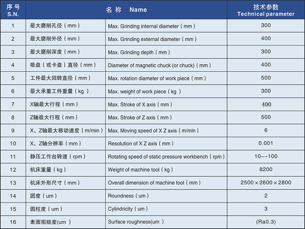 1、本機床爲二軸二聯動數控立式内(或外)圓磨床,能⛹🏻♀️對零👱🏼♂️件的内(外)圓或台階孔等多表面的磨削。