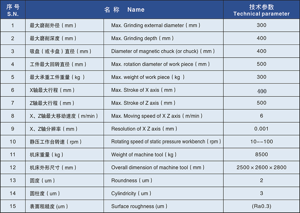 1、本機床爲二軸二聯動數控立式外圓磨床,能對零件的外圓👩🏿❤️💋👨🏽、外🔞台階面、外端面等多表面的磨削。